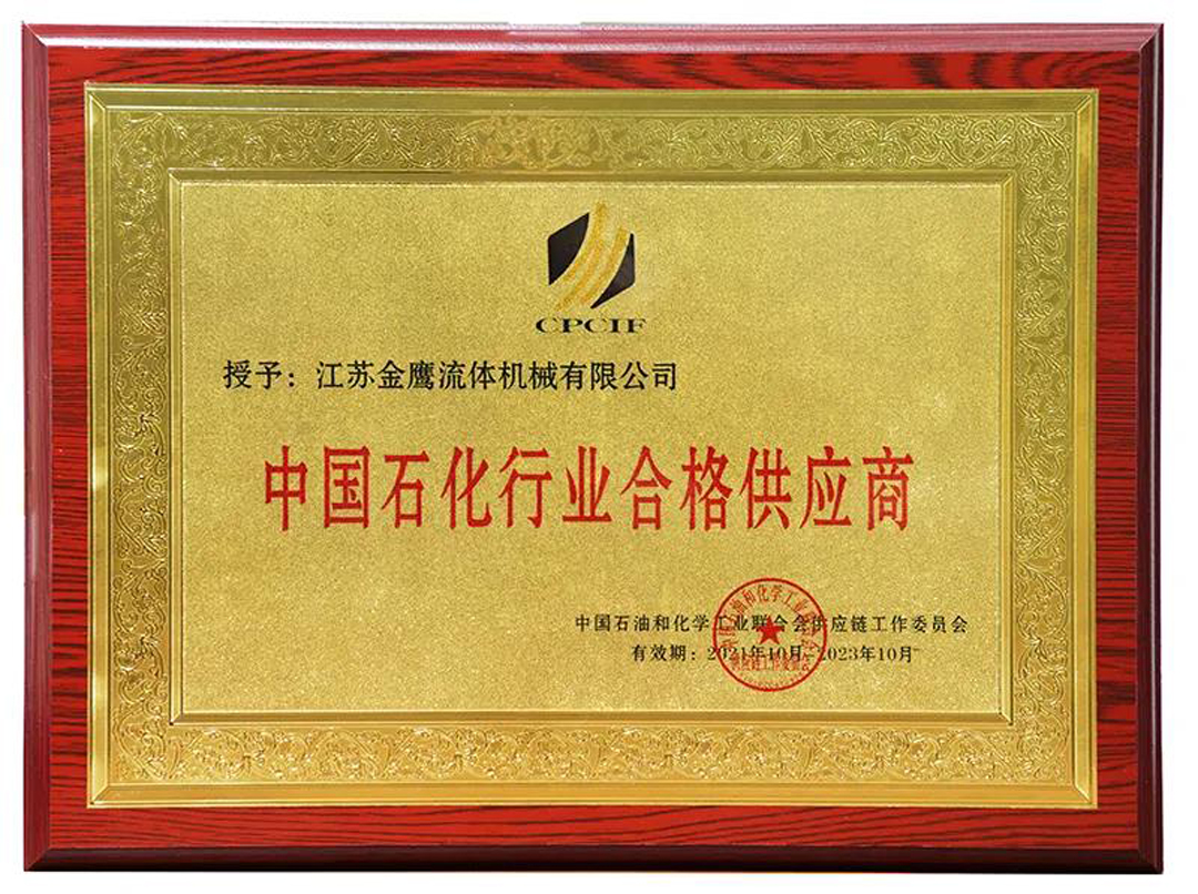 江蘇金鷹流體機(jī)械有限公司榮獲了由中國石油和化學(xué)工業(yè)聯(lián)合會(huì)供應(yīng)商鏈工作委員會(huì)頒布的《中國石化行業(yè)合格供應(yīng)商》證。